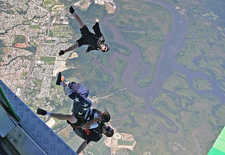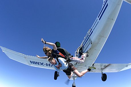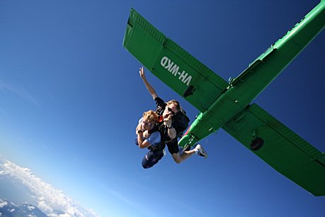Standing on the precipice of choice, your knuckles are clenched tightly as you work up the courage to make the jump. With a little assistance from your tandem master, you take that giant leap forward - thereï's no turning back now! You try to scream, but the speed of the wind rushing past your face makes it difficult, so instead, you open your eyes wide and take in the experience, now realising that you feel safe, even though you are plummeting towards the earth at an unbelievably fast speed.